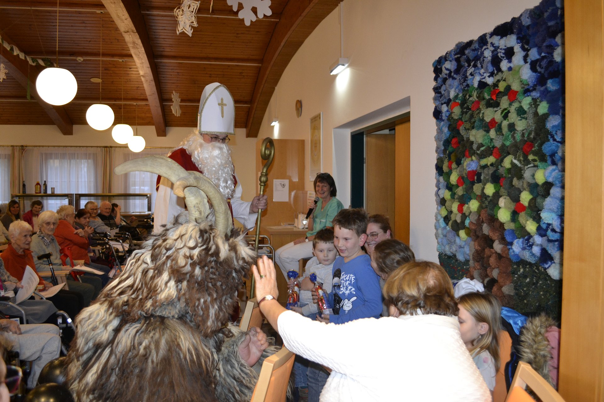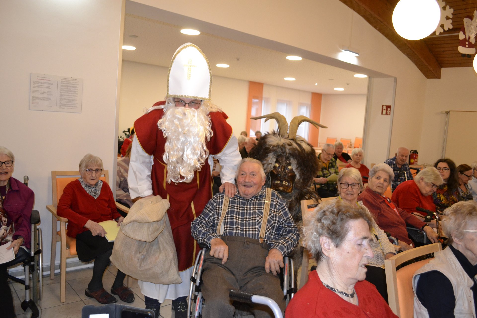 Dieses Jahr besuchte der Nikolaus gemeinsam mit einem Percht das PBZ Mank. Das ließen sich viele Bewohner*innen nicht 2-mal sagen und versammelten sich für die Nikolausfeier im Festsaal. Gemeinsam wurden Lieder gesungen und dann kam der große Auftritt. Nikolaus verteilte an alle Anwesenden Geschenke und posierte für Erinnerungsfotos. Anschließend kam der Nikolaus mit dem Percht in die einzelnen Stationen und besuchte die Bewohner*innen in ihren Zimmern. Die Freude war groß.