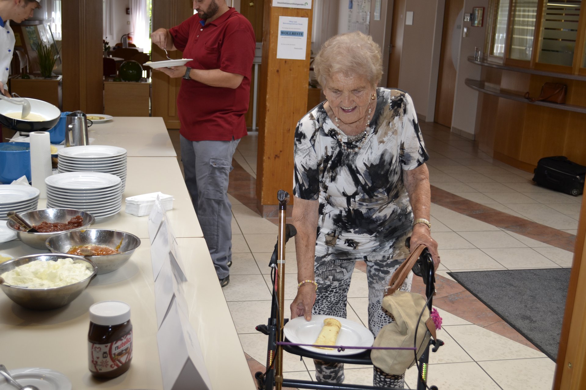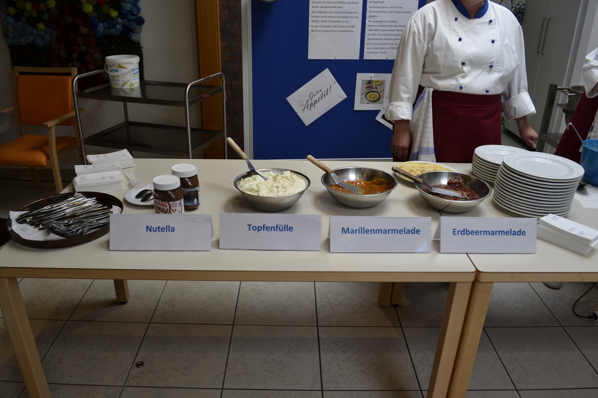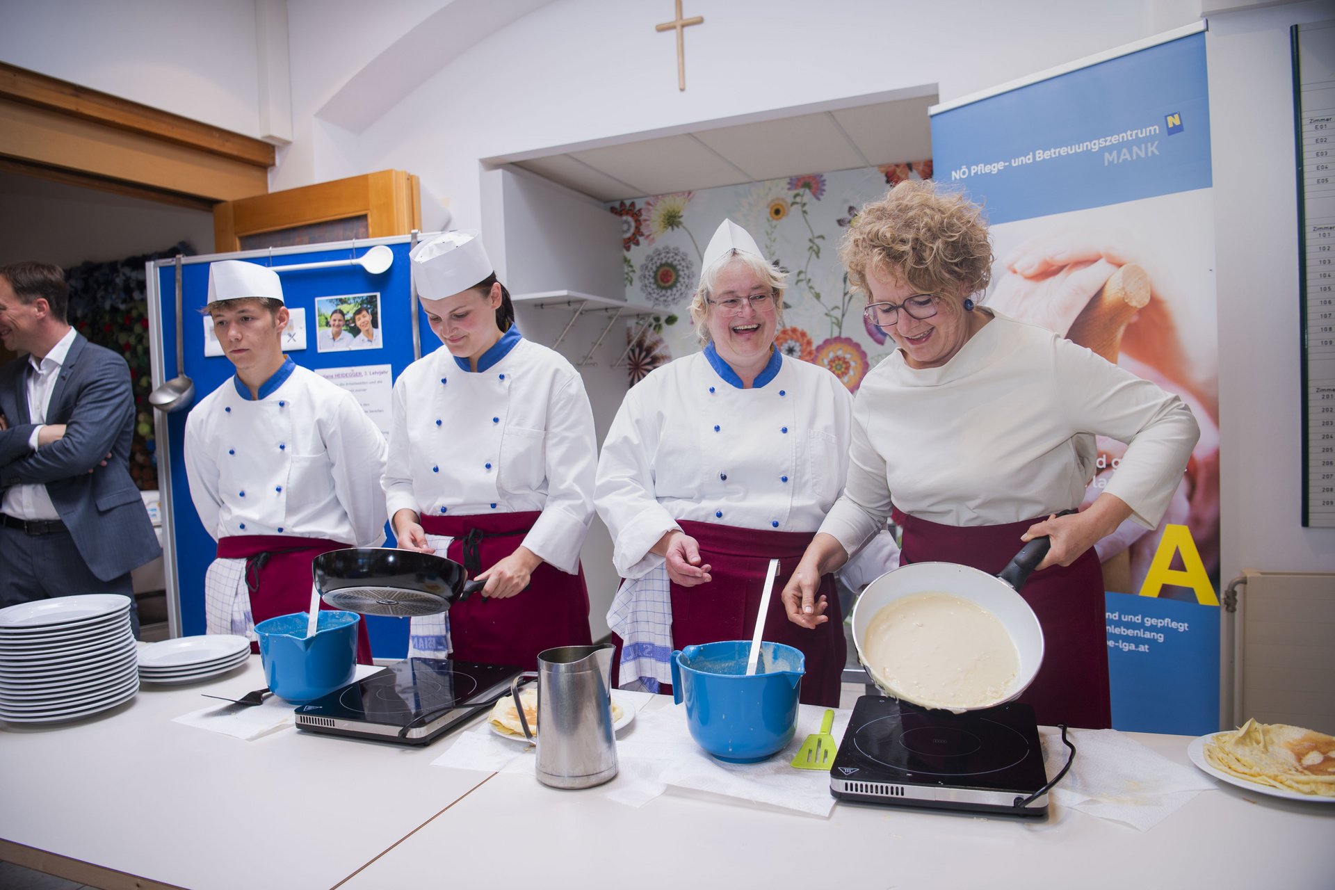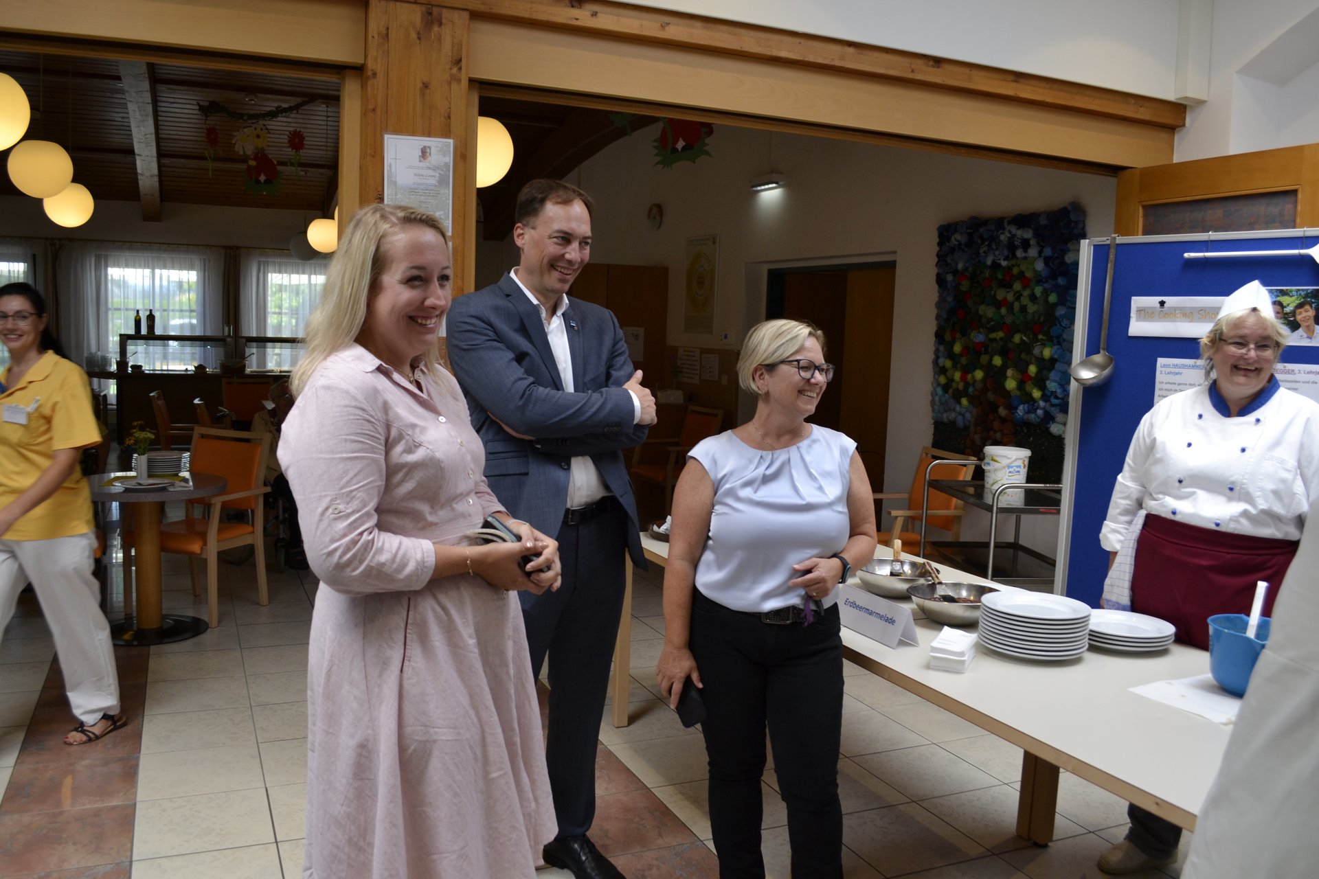 Am 5. August präsentierten sich unsere Lehrlinge der Küche mit einem Palatschinken Schaukochen. Leon Haushammer und Juliana Heidegger stellten unter der Leitung von Monika Pichler ihr Können unter Beweis. Ganz besonders freute uns im Rahmen dieser Veranstaltung der Besuch von Fr. LR Mag. Christiane Teschl-Hofmeister gemeinsam mit LGA Geschäftsführer der Region Mostviertel Martin Kaiser. Frau Landesrätin unterstützte tatkräftig. Unsere Bewohner und Bewohnerinnen kamen in den Genuss ganz frischer Palatschinken aus der Pfanne mit 4 verschiedenen Füllungen, welche sie frei wählen durften.