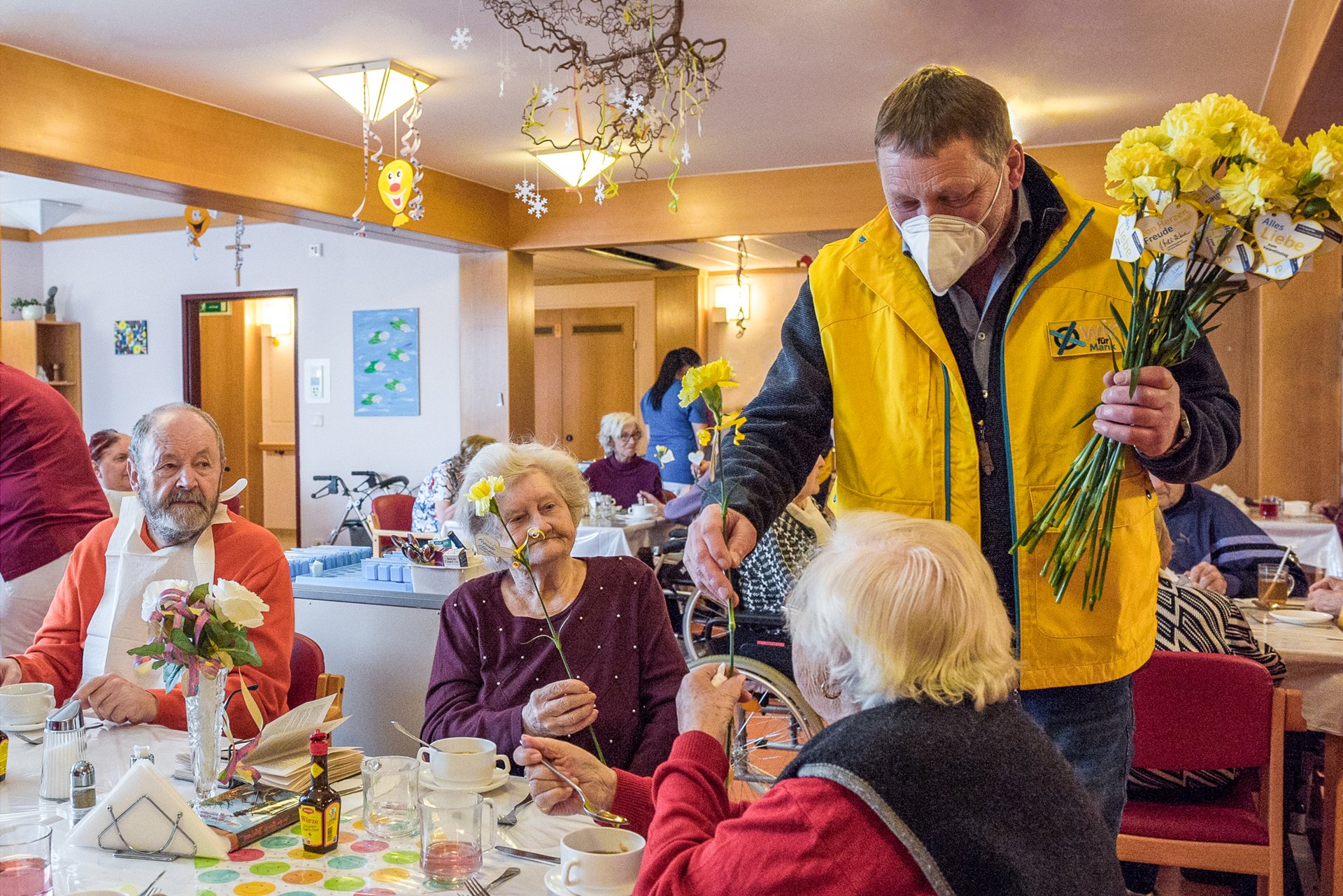 Vertreter der ÖVP Niederösterreich überreichten am 14.Februar 2023 im PBZ Mank gelbe Nelken an die Heimbewohnerinnen und Heimbewohner. Die Freude war groß!